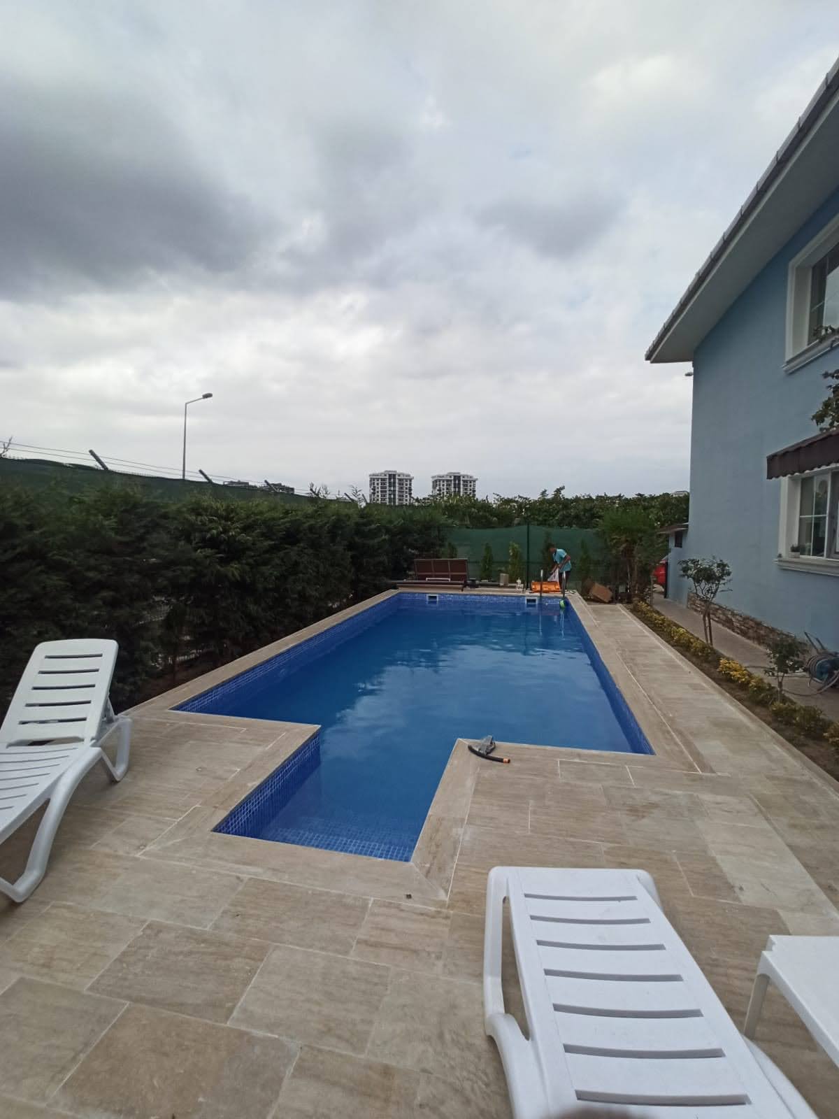 HAVUZ İÇERİSİNE ŞAP SIVA VE 1 SIRA HAVUZ KENARINA 25 CM GENİŞLİĞİNDE TRAVERTEN YAPILMASI